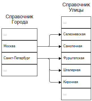 Например, есть справочник Города и справочник Улицы. В каждом городе есть собственный набор улиц. Тогда город Москва (как элемент справочника Города) может быть владельцем улиц Селезневская и Самотечная (элементов справочника Улицы). А город Санкт-Петербург может быть владельцем улиц Фурштатская, Шпалерная и Кирочная.