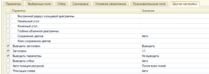 Такие параметры затем можно заменить в обработчике модуля отчета ПриКомпоновкеРезультата в тех случаях, когда заголовки отчета или его полей зависят от прикладной логики и вычисляются в коде.