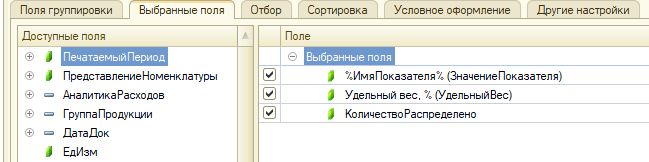 б) либо значение таких параметров с помощью функции НСтр устанавливать не в колонке Выражение, а в модуле отчета в обработчике события ПриКомпоновкеРезультата