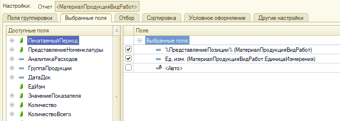 б) либо значение таких параметров с помощью функции НСтр устанавливать не в колонке Выражение, а в модуле отчета в обработчике события ПриКомпоновкеРезультата