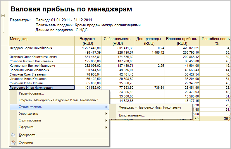 2.4. В быстрые настройки контекстных отчетов не следует включать отборы по полям, по которым устанавливается отбор через параметры в командах вызова отчета.