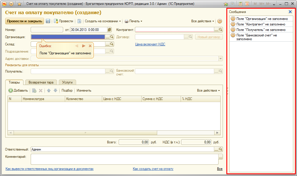 Сообщения об ошибках в форме выводятся в панели сообщений об ошибках справа: