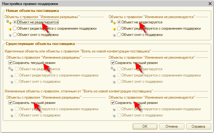 Правило «Объект поставщика редактируется с сохранением поддержки» нужно устанавливать только для тех объектов, которые изменяются при выполнении технического проекта. Правило нужно менять как можно более точечно – например, если изменения в проекте будут затрагивать только форму, то нужно изменить правило только для этой формы, а для объекта, которому эта форма принадлежит, нужно оставить правило «Объект поставщика, не редактируется».