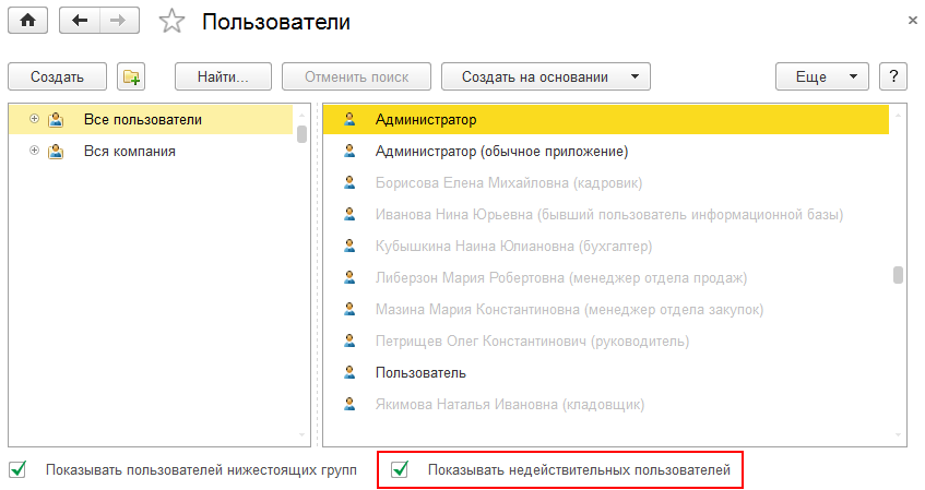 3. В формах списка и выбора пользователей рекомендуется добавить флажок «Показывать недействительных пользователей». С его помощью возможно выбрать или открыть карточку пользователя, а также снова сделать пользователя действительным (например сотрудницу, вернувшуюся из декретного отпуска).