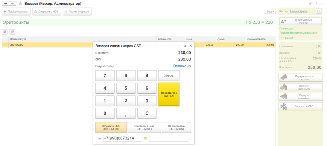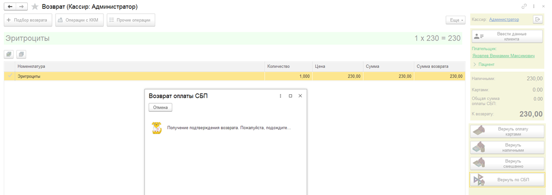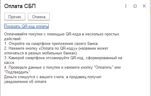 В программе поддерживается приём оплат и формирование возвратов через Систему быстрых платежей (СБП). Также имеется возможность оплаты по кассовому QR-коду, начиная с версий 3.0.17 Поликлиника, 2.0.17 Больница.