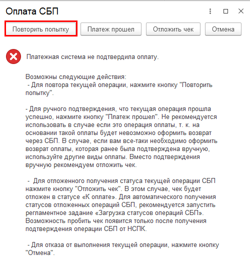 Если пациент не успел оплатить, то по окончании времени ожидания статуса платежа выводится предупреждение о том, что оплата не подтверждена, кассир может с помощью кнопки Повторить попытку продлить время ожидания еще на минуту. Будет выполнен запуск операции получения статуса оплаты.