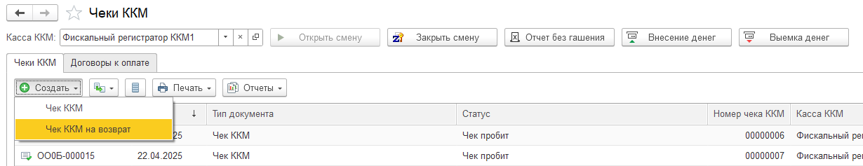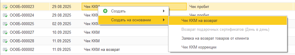 1. Полный возврат всей суммы заказа. Войдите в Чеки ККМ, найдите чек оплаты, нажмите команду Создать на основании, Чек ККМ на возврат.
