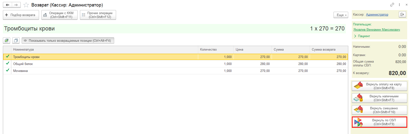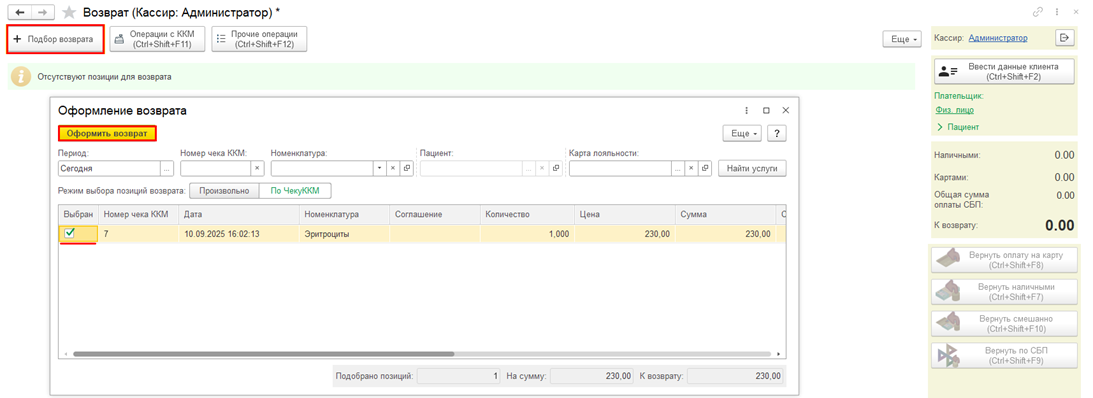 В форме возврата нажмите команду Подбор возврата, выберите услуги возврата, установив зеленый флаг напротив выбранных позиций, и нажмите команду Оформить возврат. Нажмите кнопку Вернуть по СБП.