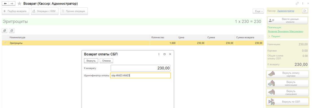 В форме Возврат оплаты СБП необходимо вставить Идентификатор оплаты, и нажать кнопку Вернуть.