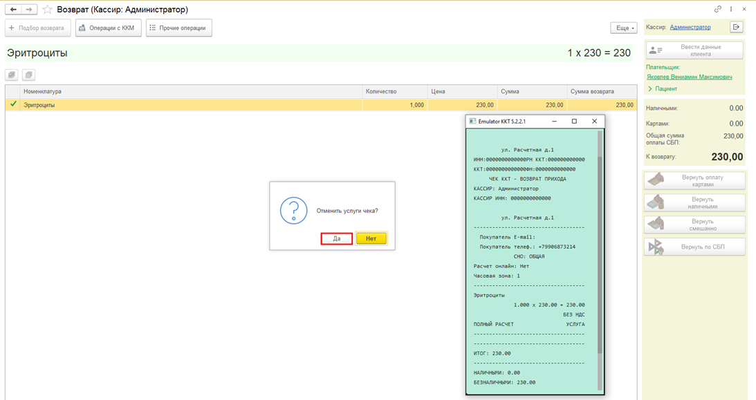 После того как будет получено подтверждение возврата, откроется форма для пробития чека возврата, нажмите кнопку Пробить чек, затем нажмите. Да в форме отмены услуг чека.