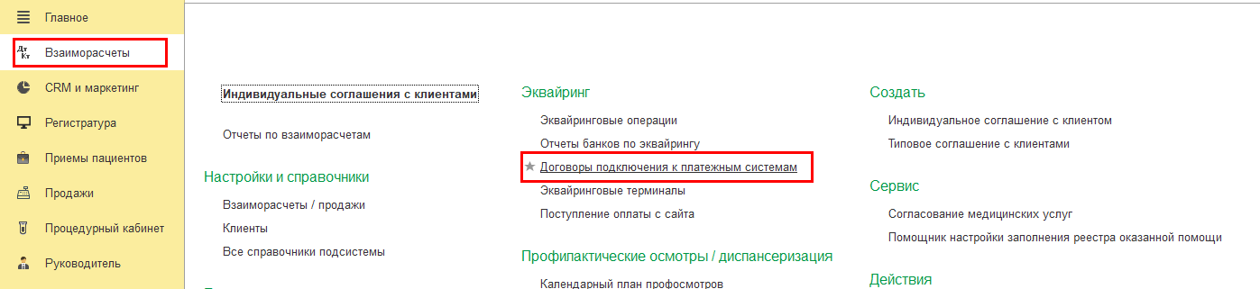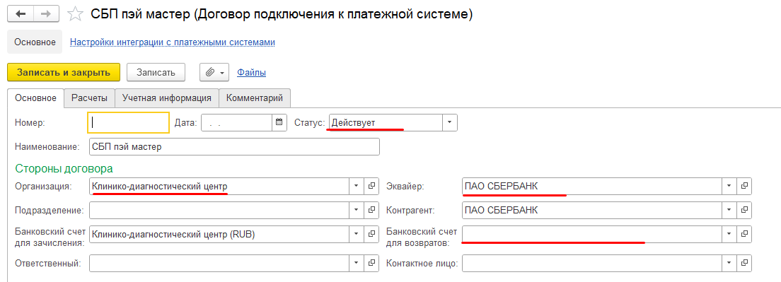 Создайте договор в справочнике Договоры подключения к платёжным системам.