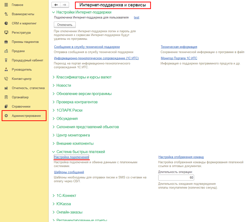 Первоначально в информационной базе нужно подключить интернет-поддержку (Администрирование, Интернет-поддержка, сервисы – Настройки Интернет-поддержки).