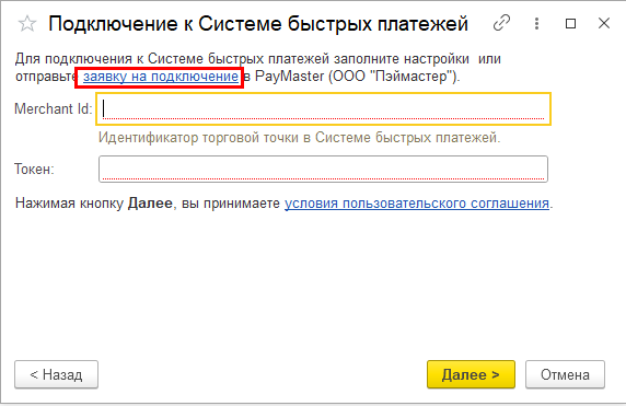 Если уже получены Merchant Ld, Токен от банка, внесите их в соответствующие поля. Если нет, необходимо отправить заявку на подключение в банк, можно использовать одноименную ссылку в открывшейся форме.