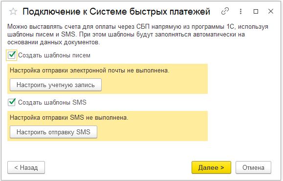 Настройте учётные записи для отправки электронной почты и СМС.