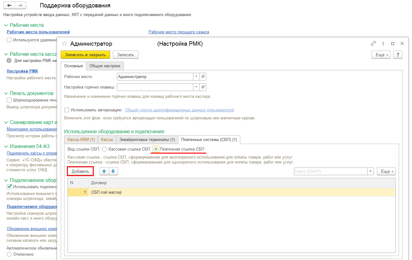 В Настройках РМК на вкладке Платежные системы СБП настройте Вид ссылки, по команде Добавить добавте договор.