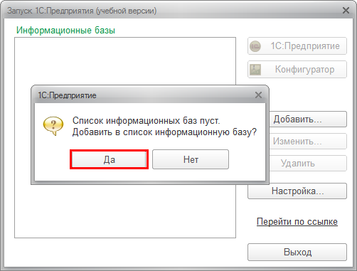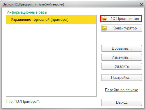 Для запуска можно использовать учебную версию 1С:Предприятия - При запуске учебной версии в списке информационных баз появится база с примерами конфигурирования (Примеры). Если список информационных баз пуст, то программа при запуске предложит добавить новую информационную базу.