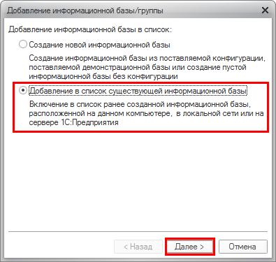 Выберите пункт "Добавление в список существующей информационной базы"; нажмите кнопку Далее >