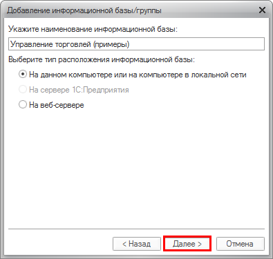 Введите наименование информационной базы, например "Управление торговлей (Примеры)"; нажмите кнопку Далее >